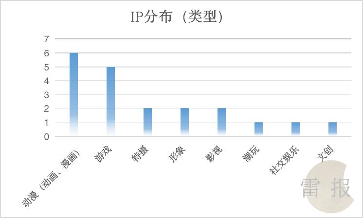 类型上,动漫(动画、漫画)类IP最多,达6席,其次游戏5席,特摄、影视、形象类各2席,潮玩、社交娱乐类、文创各1席。