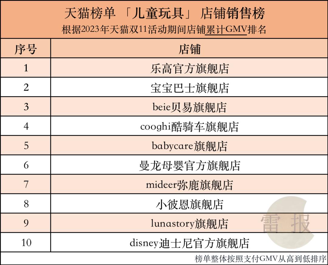 而在天猫的儿童玩具销售榜方面,第一依旧是乐高,宝宝巴士位居第二,贝易第三。值得注意的是,迪士尼官方旗舰店位居第十。去年玩具细分板块对应的前三分别是乐高、巧虎及贝易。