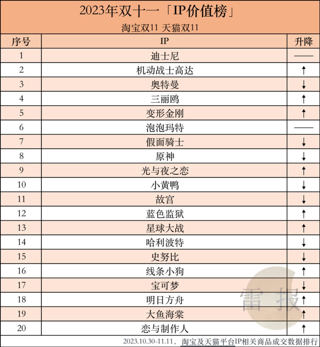 11-20位分别为故宫、蓝色监狱、星球大战、哈利波特、史努比、线条小狗、宝可梦、明日方舟、大鱼海棠、及恋与制作人。