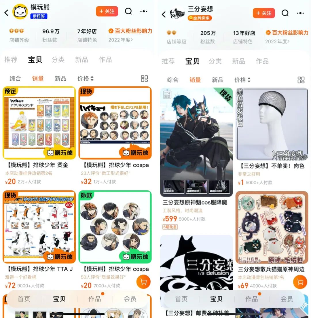 而在淘宝双11,销售榜排名前三的依次是模玩熊、三分妄想(cos服)、斌田家日代铺 。在模玩熊店铺,可以看到不少《排球少年》轻周边产品热销,三分妄想的原神产品也非常引人注目。和模玩熊一样,斌田家也主要是代购/代理日本等国的动漫周边产品。店内也有不少产品热销,《排球少年》《蓝色监狱》等IP周边的销售表现同样非常优异。