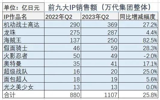 在IP价值层面,全球顶级IP公司迪士尼依旧表现强劲,机动战士高达及奥特曼都来自日本,高达的多系列周边产品可以说是万代公司的王牌产品,在国内也长期受到消费者欢迎,排名第三的奥特曼以及榜单中排名第七的假面骑士同样为万代集团带来不菲销售收入。今年Q2,《机动战士高达》整体为其创收369亿日元,《假面骑士》59亿日元,《奥特曼》41亿日元(按部分间交易消除前销售额计算)。