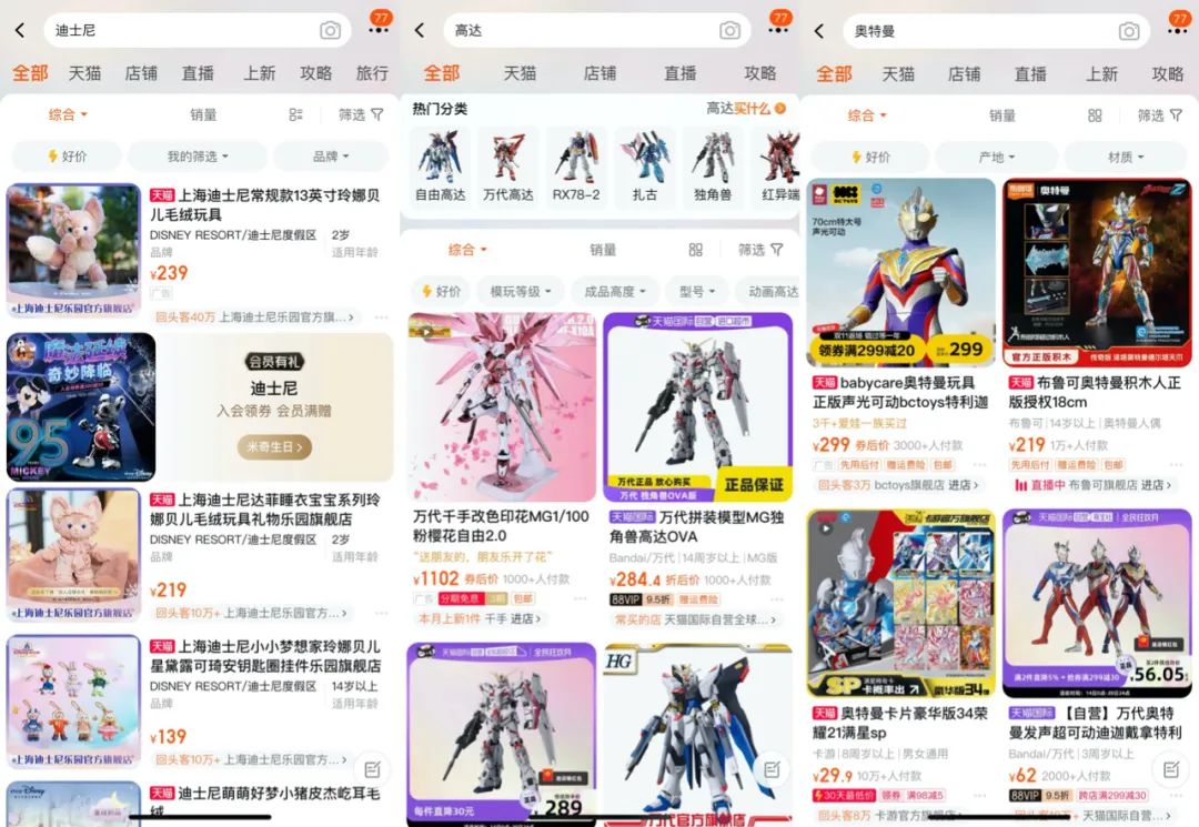 在淘宝(包含天猫)搜索相关关键词,有关迪士尼可以明显看到“顶流女明星”玲娜贝儿的身影、高达产品除了万代官方旗舰店,还涉及其他店铺,包括一些授权拼装模型等产品。 奥特曼除了儿童玩具、来自官方旗舰店产品,还有IP卡牌、人偶、书包等各色产品热销,种类丰富。