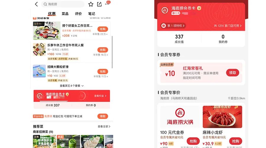 海底捞私域流量和平台公域流量的打通进一步提升了会员体验。「蓝洞商业」发现,如今在美团、大众点评搜索海底捞,在任一门店下滑都会看到自己的海底捞会员卡Tag,点击进去可以了解积分并领取常客礼,不再需要跳转多个平台,整个流程相当丝滑。