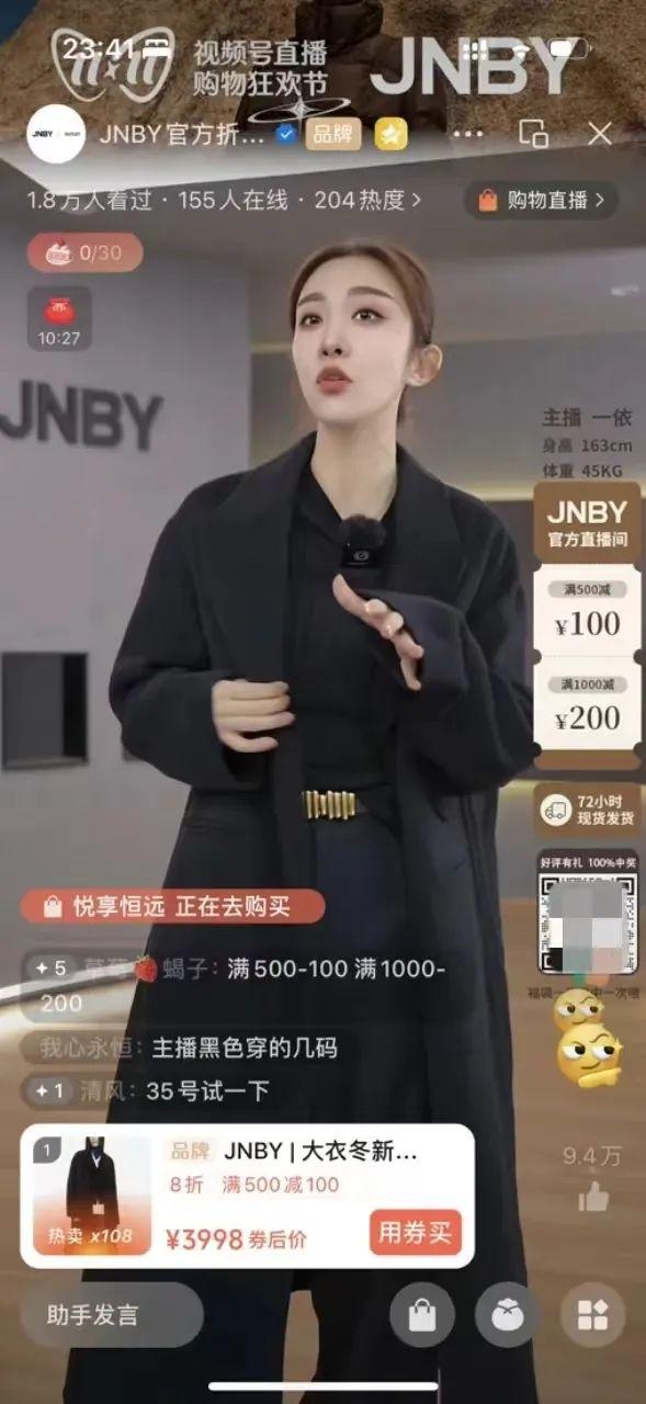 JNBY会通过直播间内容在视频号公域池找到与品牌匹配的精准客群,再通过客群打造直播间标签,完成“直播间找人、人进入直播间、在直播间完成转化、拔草”闭环。