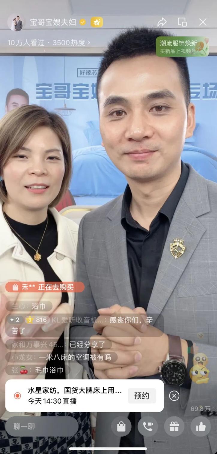 去年8月,宝哥宝嫂尝试在视频号直播带货,30天里播了54场,一个月冲到几百万销售额。他们与品牌合作的第一个专场,销售额便突破了180万。“这里销量好,退货率也低”,雪中飞、水星家纺、华盛电器等品牌后来也陆续随着与他们的合作,入驻视频号直播带货。