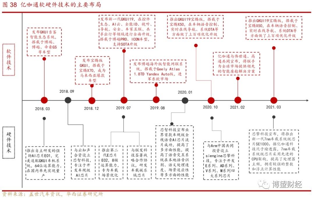 另一家是亿咖通科技。在吉利内部,亿咖通是一级供应商,为集团提供软硬件一体化能力,例如推出GKUI、GKUI 19,安装在星越、帝豪GL等多款吉利车型上。它是2017年吉利控股集团战略投资成立但独立运营的汽车智能化科技公司,其核心产品为车载芯片,覆盖智能座舱、智能驾驶、高精度地图、车载云平台等,在杭州、北京、上海、武汉、大连及瑞典哥德堡设立了分支机构以及研发中心。