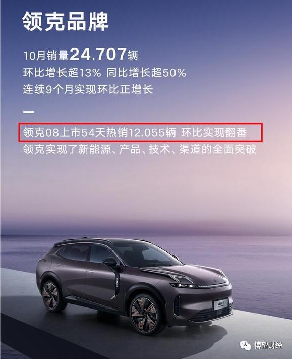 近日,吉利汽车控股有限公司发布数据显示,吉利集团10月销量再创新高达180706辆,同比增长约19%;其中,新能源汽车销售62086辆,连续三个月创新高,占比突破34%,领克车型10月销量24707辆,同比增长超50%,环比增长约13%,连续9个月实现环比正增长,领克08更是上市54天即热销12055辆,环比实现翻番。
