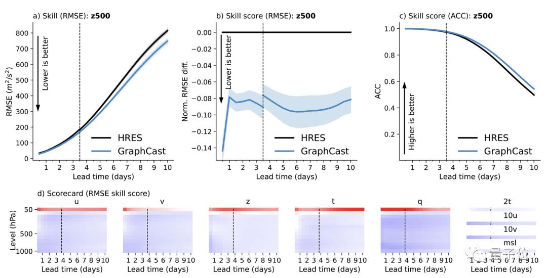 在500hPa高度场上,GraphCast的RMSE(均方根误差,数值越低表现越好)和ACC(异常相关系数)指标都显著优于HRES。