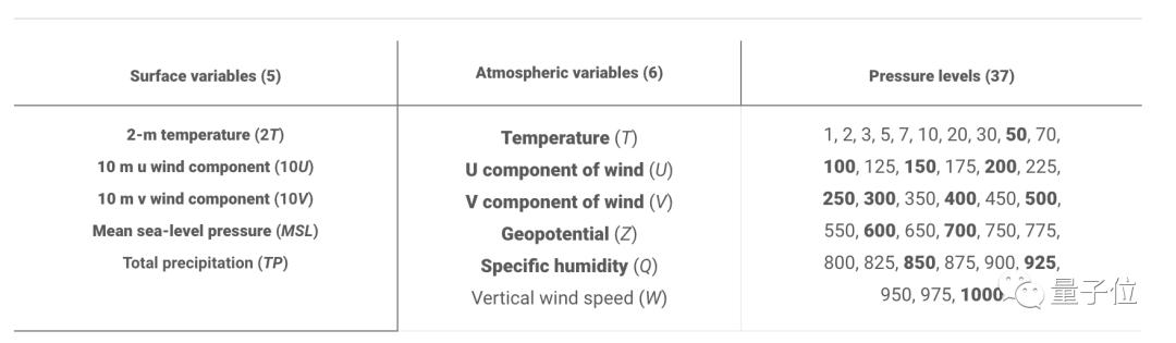 完整的变量种类和具体高度(以气压表示,单位:hPa)如下表所示: