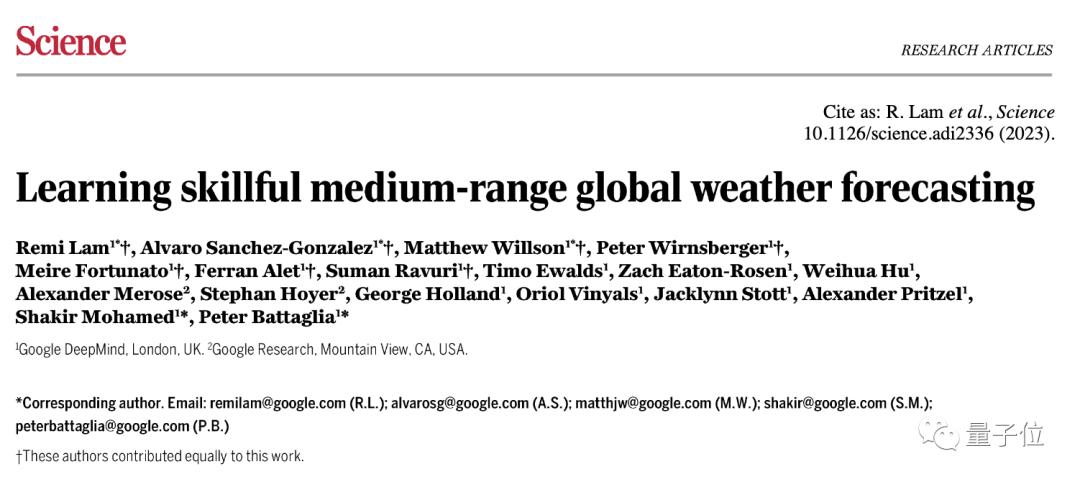 谷歌DeepMind实验室推出的天气预测大模型,已在Science杂志发表。