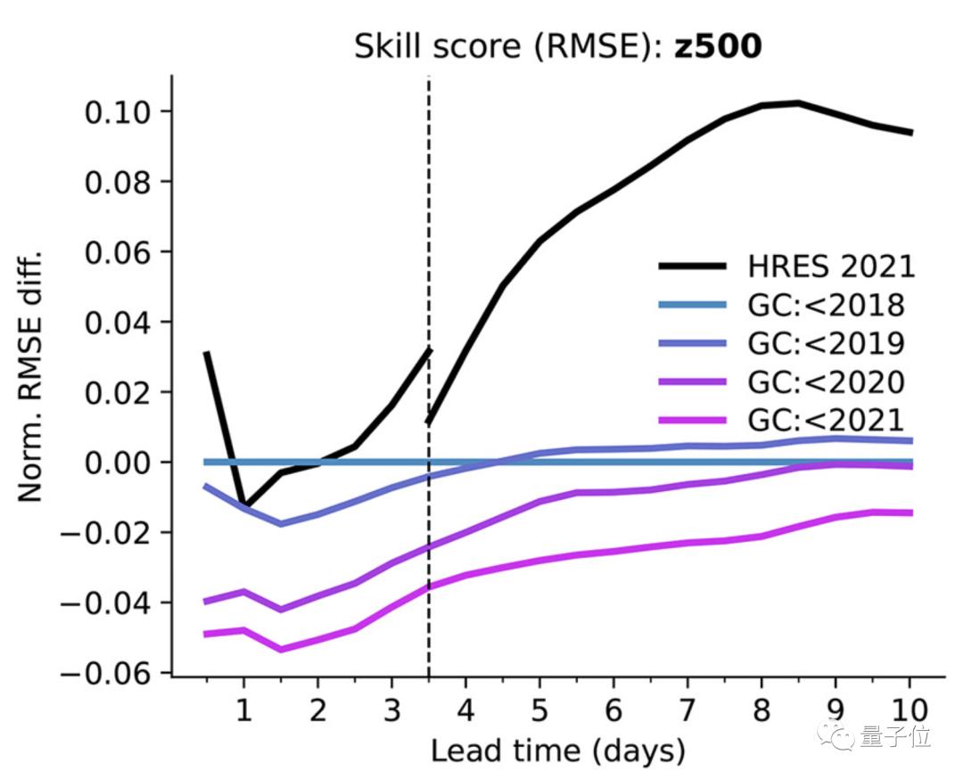 而如果使用更近期的数据,GraphCast的预测结果准确度还能继续提高。