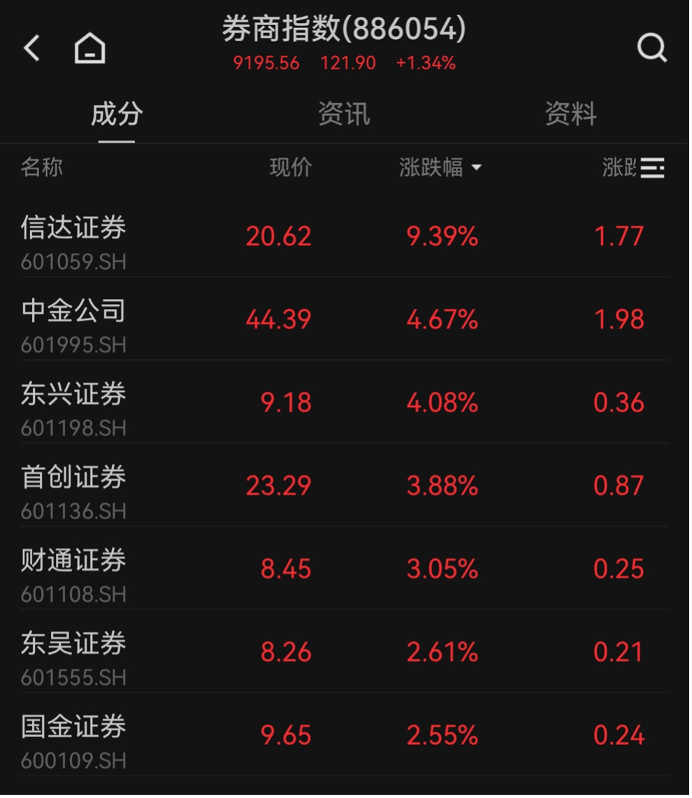 券商股盘中震荡拉升,信达证券涨超9%,中金公司、东兴证券涨超5%,首创证券、东吴证券、国盛金控、财通证券等跟涨。