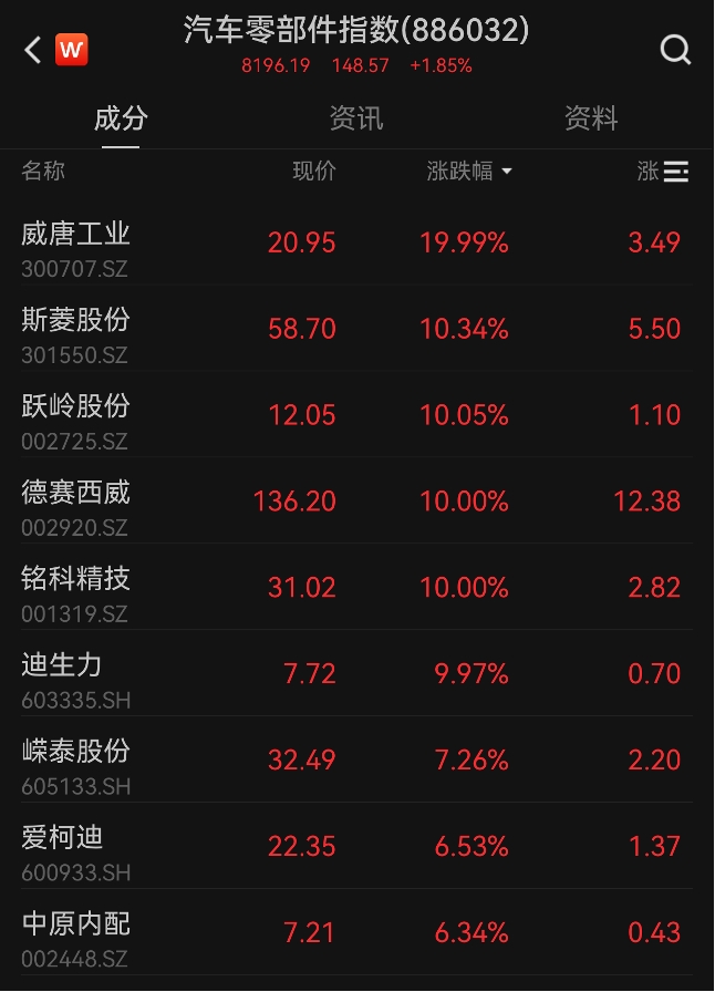 午后,汽车零部件板块震荡走高,威唐工业午后20%涨停,铭科精技、德赛西威、迪生力等多股封板,沪光股份、中原内配、爱柯迪等涨幅居前。