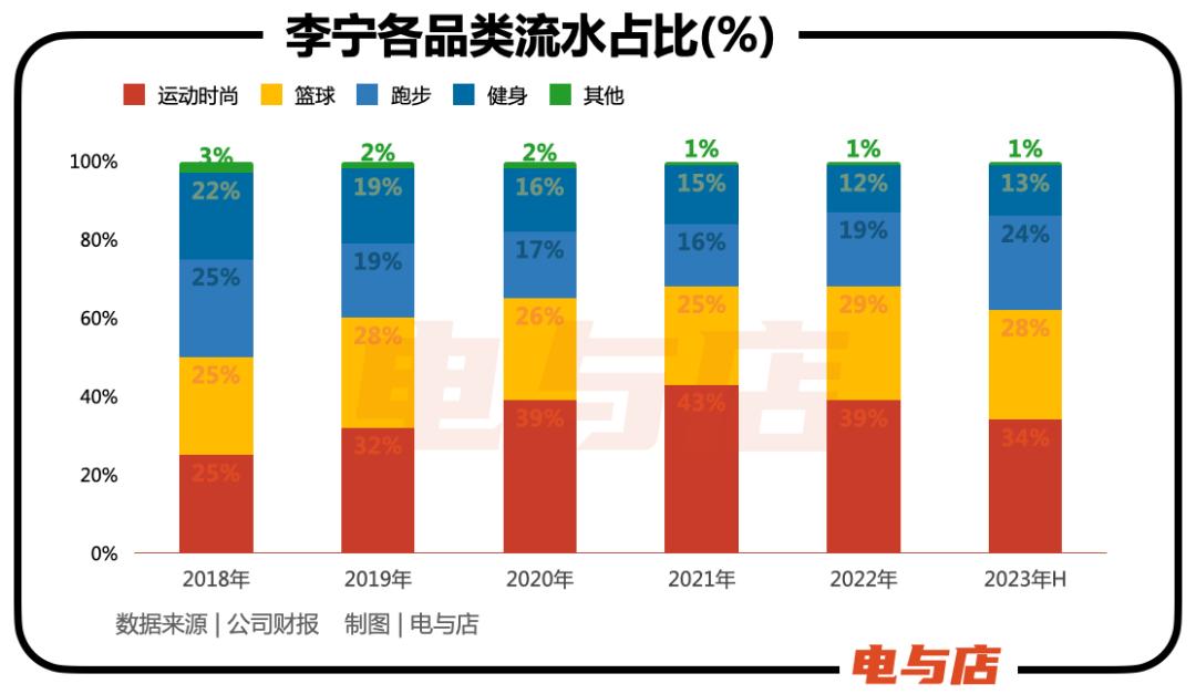 《电与店》通过分析李宁历年的业务流水变化发现,“运动时尚板块的式微”或是关键。