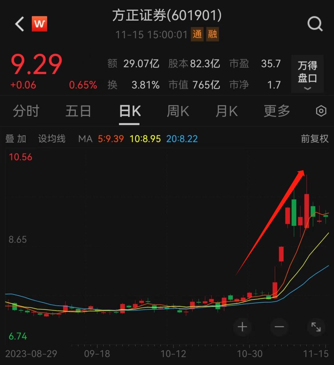 截至11月15日收盘,方正证券的股价从11月3日7元/股左右涨至10元/股附近,股价涨了近40%。