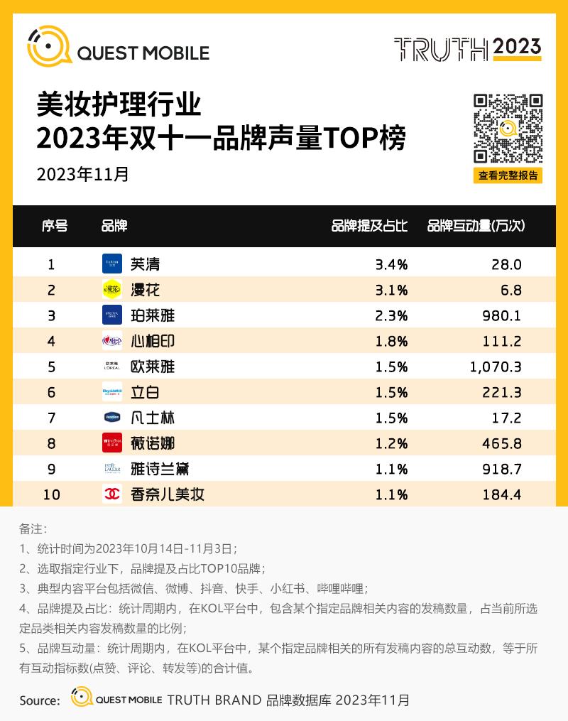 2、美妆护理行业2023年双十一品牌声量TOP榜