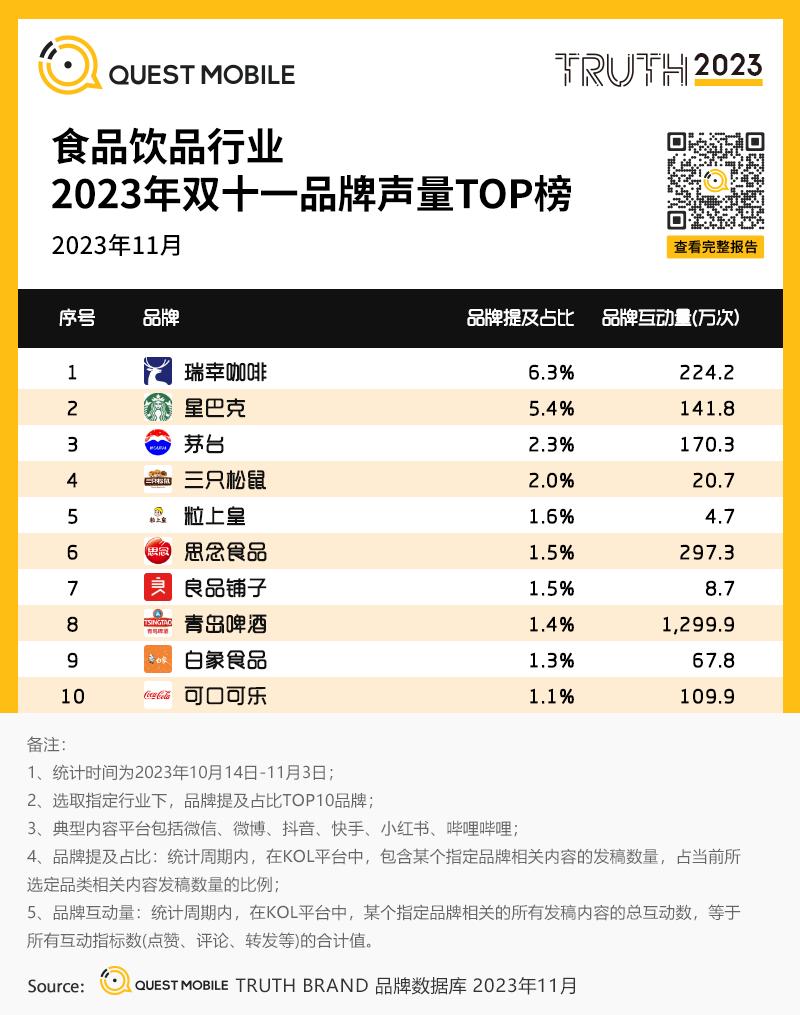 3、食品饮品行业2023年双十一品牌声量TOP榜