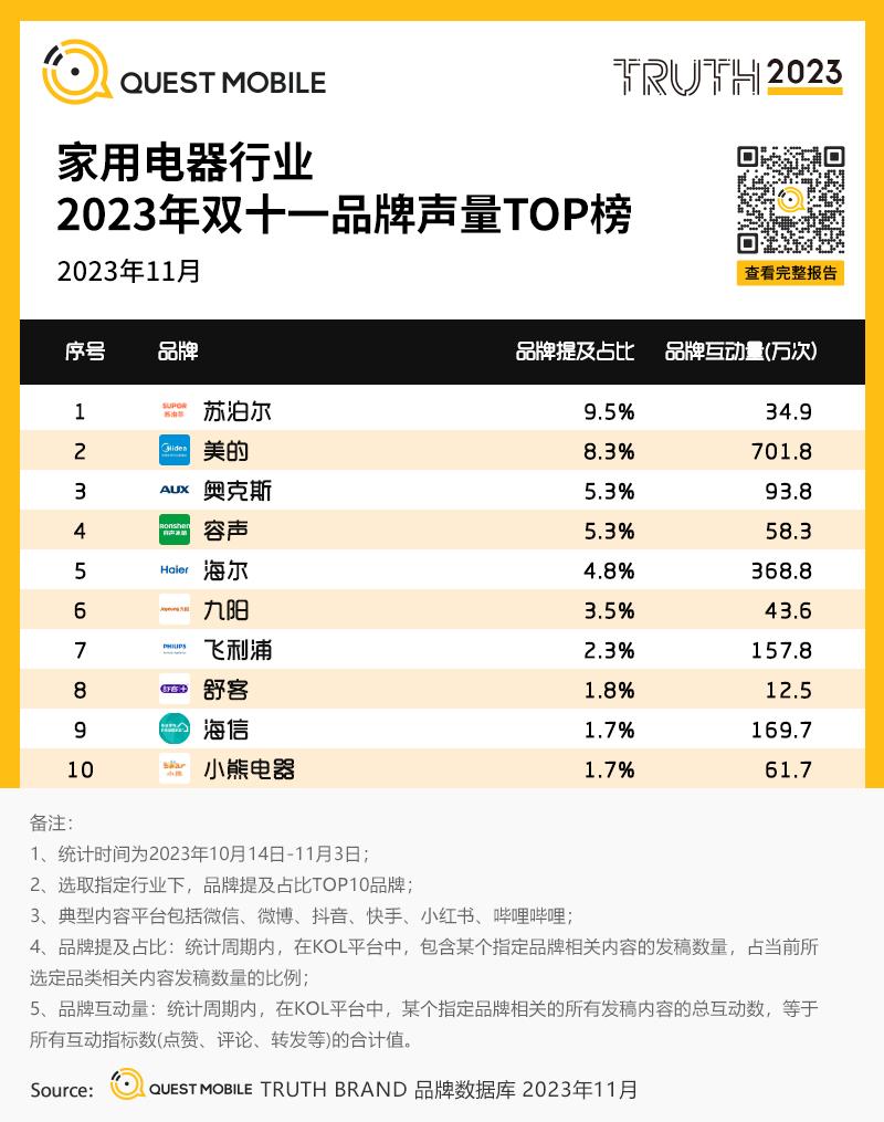 4、家用电器行业2023年双十一品牌声量TOP榜