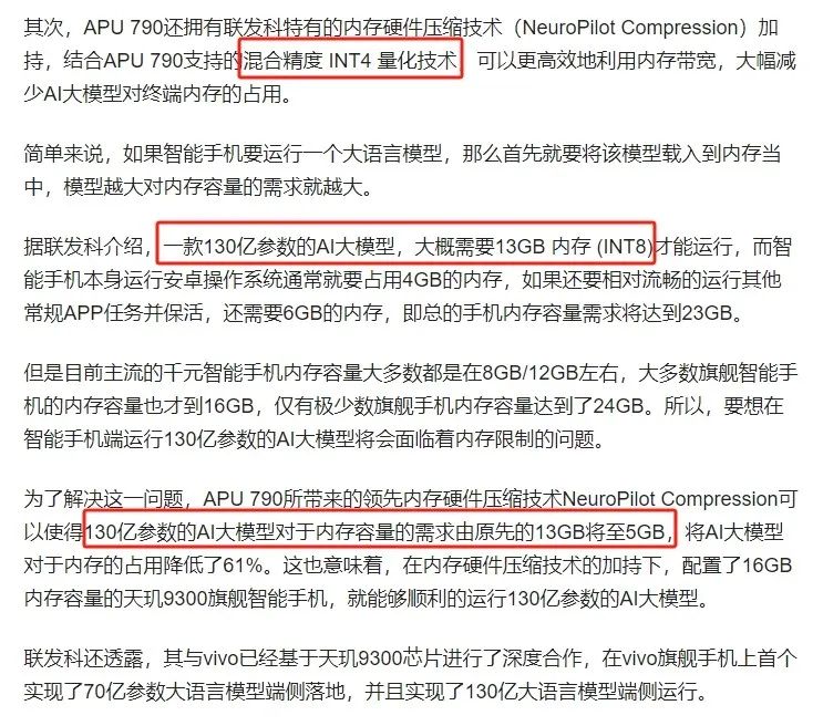 对用户实际使用影响最大的部分是大量的RAM消耗。在MTK 9300的官方发布中,联发科官方介绍说,一个拥有1300亿参数的AI大模型大约需要13GB的内存(在INT8精度下)才能运行。因此,即使是一个拥有70亿参数的模型,也大约需要7GB的内存。尽管存在一些技术,如INT4量化(通过降低计算精度以减少内存消耗),但是在完整调用运行一个7B的AI模型时,也需要至少4GB的内存消耗。这对于RAM资源本就非常宝贵的Android系统来说,无疑是雪上加霜。