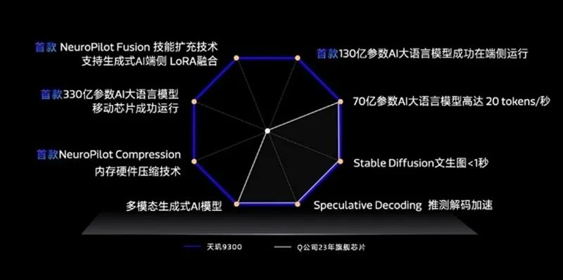 尽管MTK 9300和高通8gen3这两款旗舰芯片没有公开其实际运行模型的测试过程,我们仍可以从它们的声明中获取一些信息。MTK 9300强调,它可以在运行参数量为70亿(7B)的模型时实现20 tokens/s的性能。