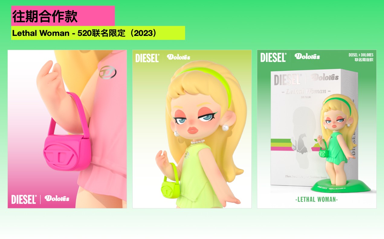 此次联名合作是 DIESEL X Dolores 联名企划的第三个季度策划,联名盲盒将于11月正式上线开售。