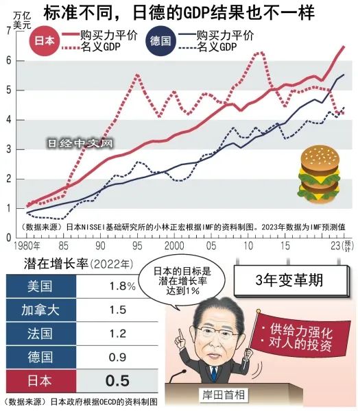 笔者认为不合理之处在于,用作对比的是以美元计算的名义GDP。因此不能忽视2022年以来的因日元快速贬值导致的日本经济在换算成美元后缩水。日常生活中的结算,多是以本国货币进行。因此,我们用购买力平价(PPP)的标准(在不同国家购买“巨无霸”汉堡等相同商品需要各自花费多少钱)来比较一下日本和德国。