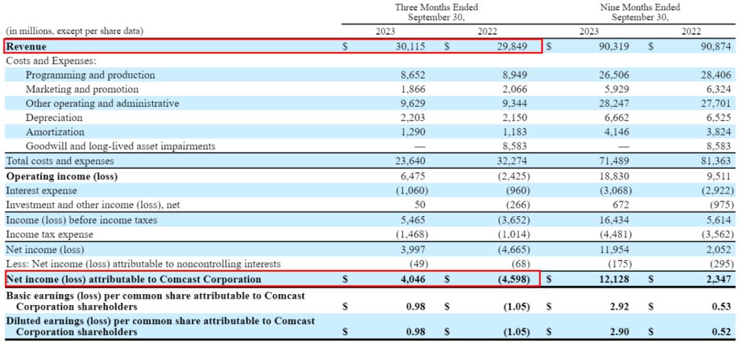康卡斯特Q3及前9个月业绩情况