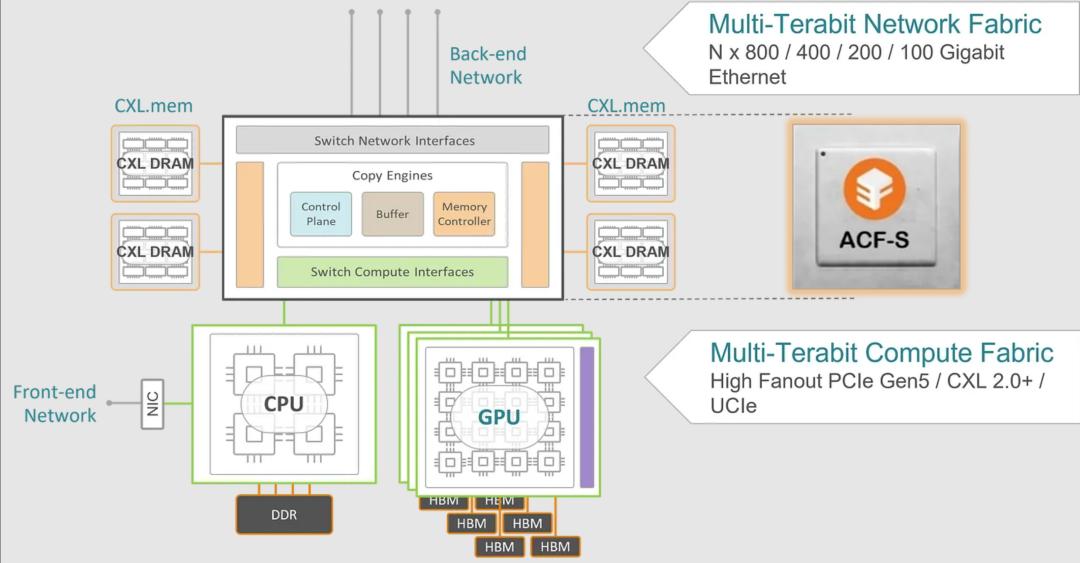 它的第一款芯片叫做ACF (Accelerated Compute Fabric)转换芯片,它能够让GPU算力池与数十TB的本地CXL.mem DRAM池直接连接,延迟极低。