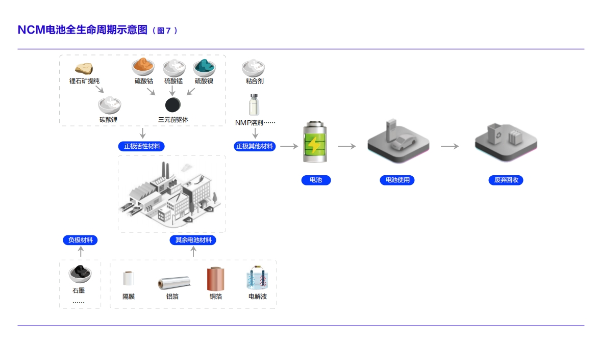 三元锂电池全生命周期示意图 图片来源:《动力电池碳足迹及低碳循环发展白皮书》