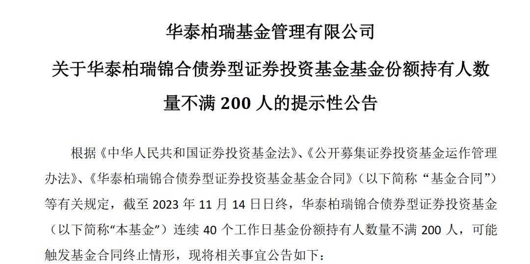 11月16日,华泰柏瑞基金发布公告称,公司旗下华泰柏瑞锦合债券型债证券投资基金(下称“华泰柏瑞锦合债”),截至2023年11月14日终,已经连续40个工作日基金份额持有人不足200人,可能触发基金终止运作的情形。
