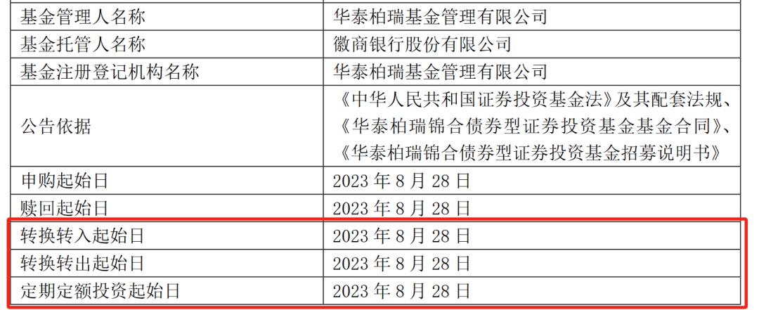 而华泰柏瑞基金8月24日发布的公告显示,2023年8月28日起,华泰柏瑞锦合债正式开放,可以进行日常的申购、赎回、转换等业务。