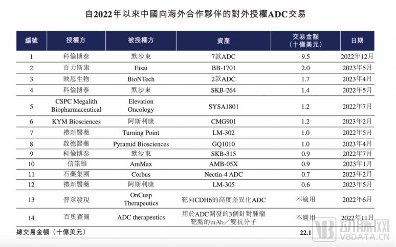 截至2023年上半年,在海外将其ADC管线对外授权的10家中国公司、14条管线