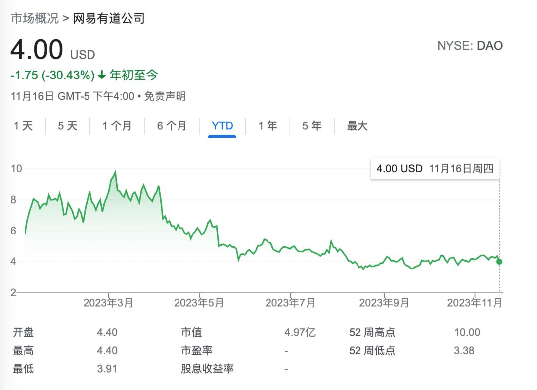 截至本文,有道公司今年以来股价下跌30.4%,当前市值为4.97亿美元。