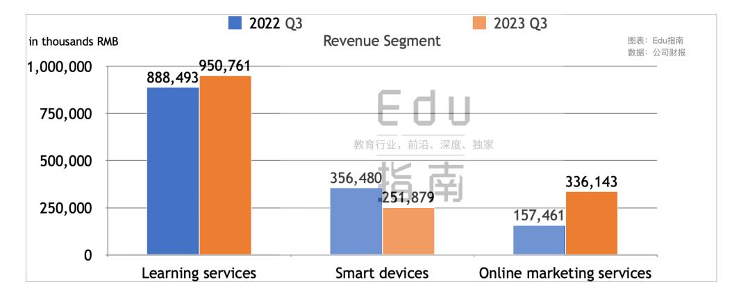 最新季度有道三项业务中,在线营销服务收入增速最快,其次为学习服务。