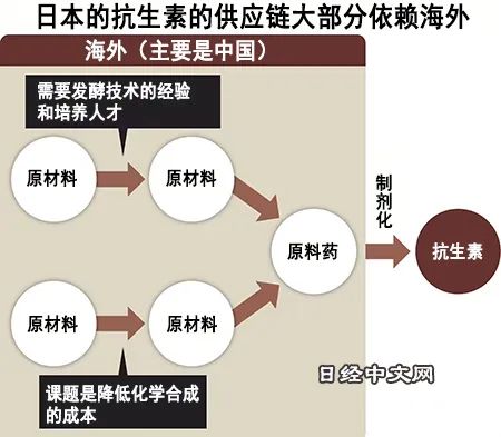 在日本,经常用于手术等的“β-内酰胺类”抗生素的原料物质几乎100%依赖中国。日本厚生劳动省2022年12月根据《经济安全保障推进法》,把抗生素指定为“特定重要物资”。2023年夏季,认定了负责日本国内制造的企业。