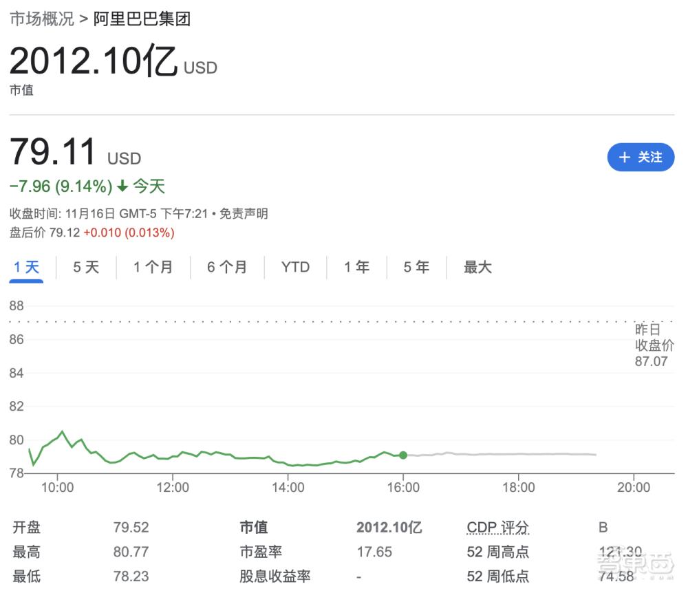 阿里美股在财报发布后盘前跌9%
