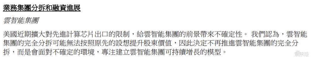 根据财报,美国近期扩大对先进计算芯片出口的限制,给云智能集团的前景带来不确定性。 阿里认为,云智能集团的完全分拆可能无法按照原先的设想提升股东价值,因此决定不再推进云智能集团的完全分拆,而是会面对不确定的环境,专注建立云智能集团可持续增长的模型。