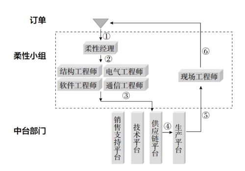 订单交付过程中,高频变化通常发生在客户接触点。客户接触点包括我方柔性经理(柔性小组负责人/项目经理)与对方项目负责人的接触,以及我方现场交付负责人与客户需求部门负责人的现场接触。只要客户产生了新的需求,柔性小组就需要以很快的速度响应,分析客户需求,把客户需求转化为技术语言,然后快速实现跨领域技术合作,并将需求信息转化为技术图纸、物料清单、指导说明书等,用标准化程序和标准语言体系向中台部门发出指令。中台部门根据清晰的指令为柔性小组提供支持。