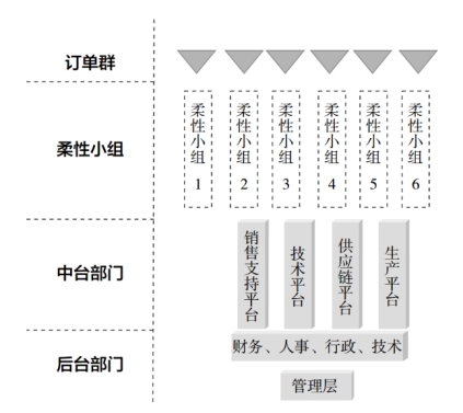 “章鱼型柔性组织”模型由三大板块组成:柔性小组(前端)、中台部门(中端)、后台部门(后端)。柔性小组负责直接响应客户需求;中台部门不直接面对客户,负责支持柔性小组完成交付;后台部门不对具体订单负责,负责支持公司的各个部门。