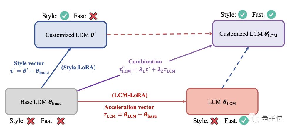 LCM-LoRA训练得到的LoRA参数又称为加速向量,可以数据集上微调得到的LoRA参数直接线性组合,不需要额外训练。