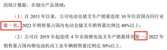 中力股份上会稿显示,自2013年以来,公司电动仓储叉车产销量连续10年位居国内同行业第一名,2022年销售量占国内电动仓储叉车销售量比例达40%以上。