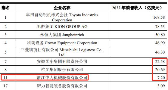 国际竞争对手方面,中力股份申报稿中列举了丰田自动织机株式会社、凯傲集团、永恒力集团、三菱物捷仕有限公司、科朗设备等。