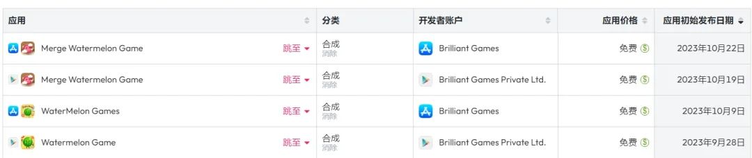 如果在数据网站搜索“watermelon”“suika”之类的关键词,你还能找到一长串萌萌西瓜头,并且绝大部分出自海外团队之手。更夸张的是一家名为Brilliant Games的厂商:在《Suika Game》爆红后,他们一个月内就火速做出了两款同类产品,还拿下了日本免费榜Top2。加上2021年2月上架的《Watermelon Merge》,可以说每次都冲锋在了“吃瓜最前线”。