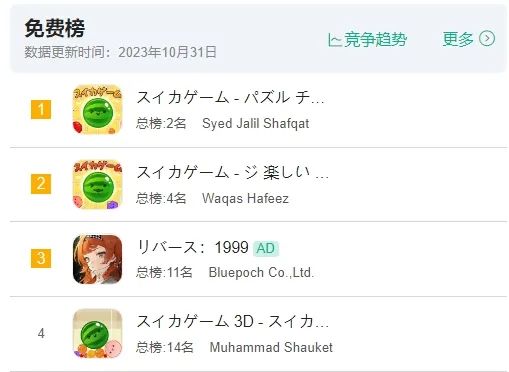 最近两个月,你可能已经从许多新闻里面知道了这件事。但我怎么也没想到,这个明显有些过气的玩法,能够翻红得这么彻底:在日本市场,免费榜头部已经成了一片“瓜田”。与此同时,包括美国、法国、新加坡等地区,也都出现了不少顶着西瓜icon的产品。