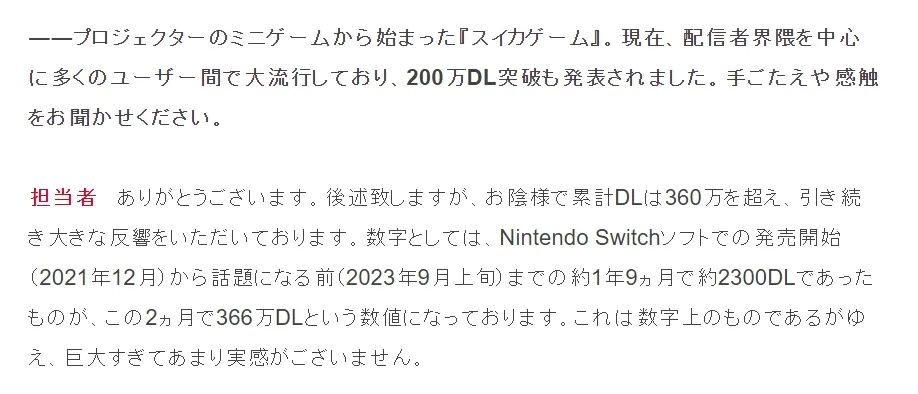 《Suika Game》爆红之后,Aladdin X项目负责人在本月初接受过日本媒体的采访。据采访内容透露,游戏目前销量已经达到了366万份(其中在日本市场卖出了327万份)。而在今年9月之前,这一数字仅仅为2300份,也就是在两个月内猛涨了1400多倍。