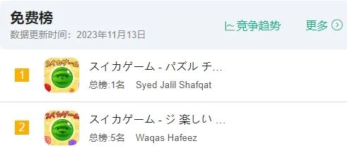 以日本市场排名前二的《Suika Game-谜题挑战3D》以及《Suika Game-益智游戏》为例,两款作品均由个人开发者上传,从名称上看大概率归属于中东地区。除此之外,游戏从玩法到美术素材基本完全一致,只有商店icon存在颜色上的细微区别。