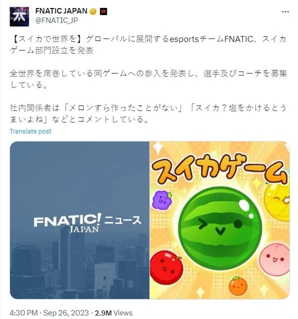 具体火到什么程度?就连老牌电竞战队Fnatic的日推账号也主动蹭起这波热度,表示他们将正式成立「Suika Game分部」,并且正在招募选手与教练。不过鉴于结尾那句“西瓜沾盐很好吃”,这大概率也只是一次整活而已。