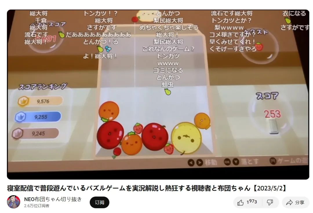 直到今年5月,游戏主播布団ちゃん突然以「寝室配信」为主题,直播起了投影仪版本的《Suika Game》。用最近流行的话来说,大概是“命运的齿轮开始转动”。