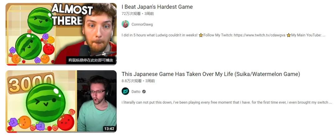 不仅如此,部分面向英文受众的管人主播,更是让《Suika Game》逐渐火到了欧美地区。包括油管、推特等社交媒体都开始出现“挑战日本最难游戏”等话题。尽管大部分人都没搞明白《Suika Game》的原型,但重要的是,游戏已经在全球范围掀起了新的「病毒式传播」。