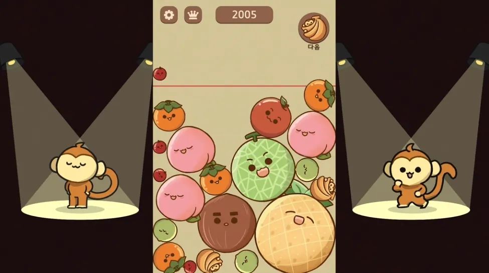 当然,也并非所有“大西瓜”都一成不变。例如韩国厂商Q-SSUM STUDIO的《西瓜游戏-猴子乐园》,就加入了「看板猴」、香蕉等新元素,以及偏萌系的手绘画风。